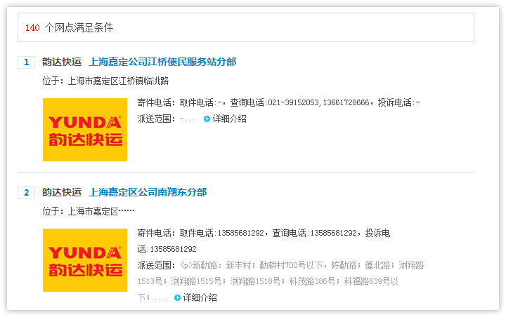 2、查詢結(jié)果頁面顯示符合條件的快遞公司網(wǎng)點(diǎn)列表,顯示快遞網(wǎng)點(diǎn)所在區(qū)域,公司地址和聯(lián)系電話,如需查看更多信息,點(diǎn)擊 【查看詳情】進(jìn)入網(wǎng)點(diǎn)詳細(xì)頁面查看。