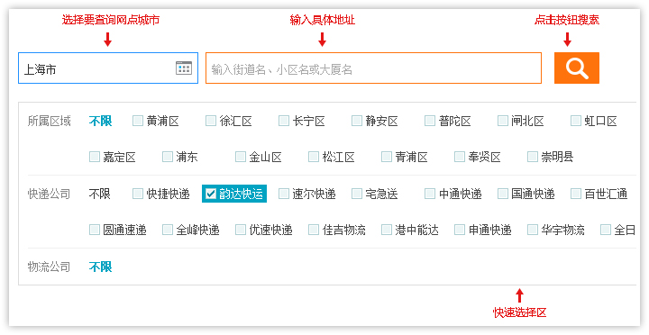 1、進(jìn)入 2、查詢結(jié)果頁面顯示符合條件的快遞公司網(wǎng)點(diǎn)列表,顯示快遞網(wǎng)點(diǎn)所在區(qū)域,公司地址和聯(lián)系電話,如需查看更多信息,點(diǎn)擊 【查看詳情】進(jìn)入網(wǎng)點(diǎn)詳細(xì)頁面查看。 3、點(diǎn)擊網(wǎng)點(diǎn)名,即可進(jìn)入網(wǎng)點(diǎn)詳情頁查看詳細(xì)信息。