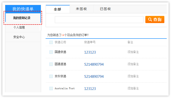 2、用戶中心點(diǎn)擊【我的查詢記錄】,進(jìn)入我的快遞單查詢記錄頁(yè)面,即可對(duì)曾查詢過的快遞單進(jìn)行搜索與查看。