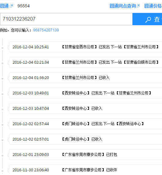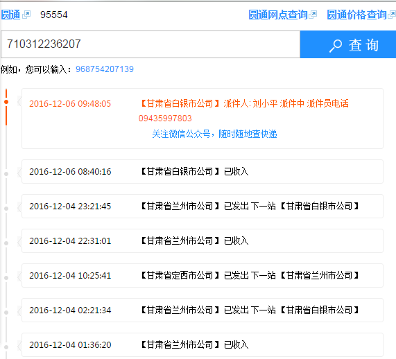 圓通快遞 運(yùn)單號(hào) 710312236207一般3到4天收到貨,現(xiàn)在7天沒(méi)收到。原因是圓通甘肅甘肅把我發(fā)白銀的貨發(fā)定西去了,從定西發(fā)回蘭州。再發(fā)白銀,蘭州離白銀70公里走了34個(gè)小時(shí)。大圓通95554電話(huà)聯(lián)系干脆拒接。我不明白這樣的公司怎么還能生存。行走路線(xiàn)截圖給大家看看。