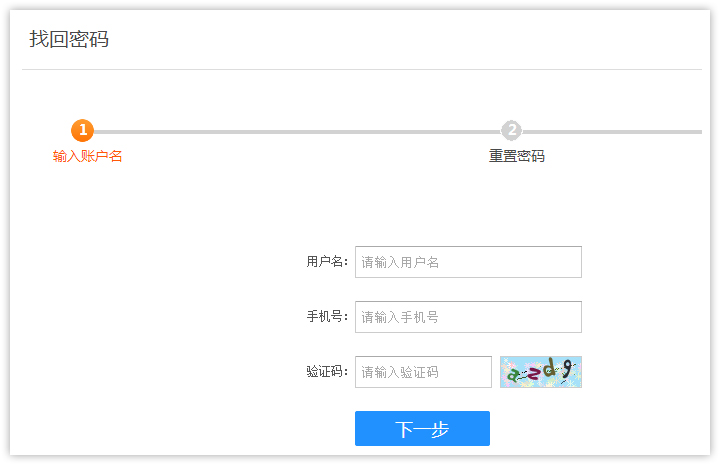 2、進(jìn)入找回密碼頁(yè),填寫(xiě)您的用戶(hù)名和注冊(cè)時(shí)所用手機(jī)號(hào),進(jìn)入重置密碼頁(yè),即可對(duì)您丟失的密碼進(jìn)行重置。