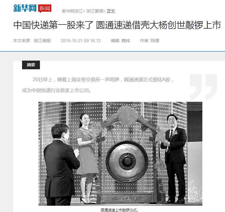 2016年10月20日上午9點(diǎn)30分,隨著在上海證券交易所一聲?shū)Q鑼?zhuān)瑘A通速遞股份有限公司正式登陸A股,成為中國(guó)快遞行業(yè)首家上市公司。