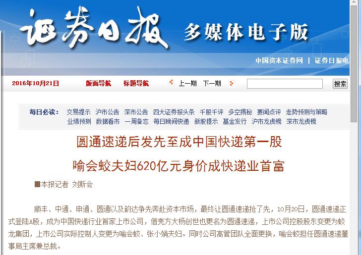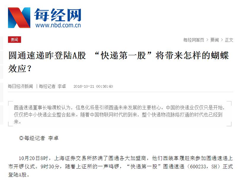 圓通速遞成功上市的消息引起了各大媒體的熱切關(guān)注。新華網(wǎng)、中華工商時(shí)報(bào)、新京報(bào)、每日經(jīng)濟(jì)新聞、第一財(cái)經(jīng)、經(jīng)濟(jì)觀察報(bào)、證券日?qǐng)?bào)、新聞晨報(bào)、南方都市報(bào)、錢(qián)江晚報(bào)等近百家媒體對(duì)此紛紛進(jìn)行宣傳報(bào)道,轉(zhuǎn)載量達(dá)千余次。