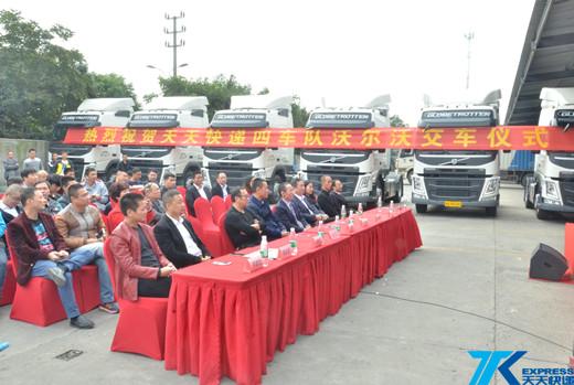 10月30日上午,天天快遞四車隊(duì)沃爾沃交車儀式在天天快遞杭州集散舉行,天天快遞總部運(yùn)管部調(diào)度中心相關(guān)負(fù)責(zé)人、杭州集散中心經(jīng)理鄭建宏,天天快遞四車隊(duì)鑫淼物流總經(jīng)理李德平,沃爾沃中國(guó)華東區(qū)總經(jīng)理沈力強(qiáng),寧波甬沃汽車有限公司總經(jīng)理姚程宏,浙江萬(wàn)盾資產(chǎn)管理有限公司總經(jīng)理助理徐婧,山東駿通專用車有限公司總經(jīng)理張建強(qiáng),浙江宗海物聯(lián)網(wǎng)發(fā)展有限公司總經(jīng)理張文進(jìn),浙江高速交警總隊(duì)徐洋,下沙派出所所長(zhǎng)周春華參加本次儀式。